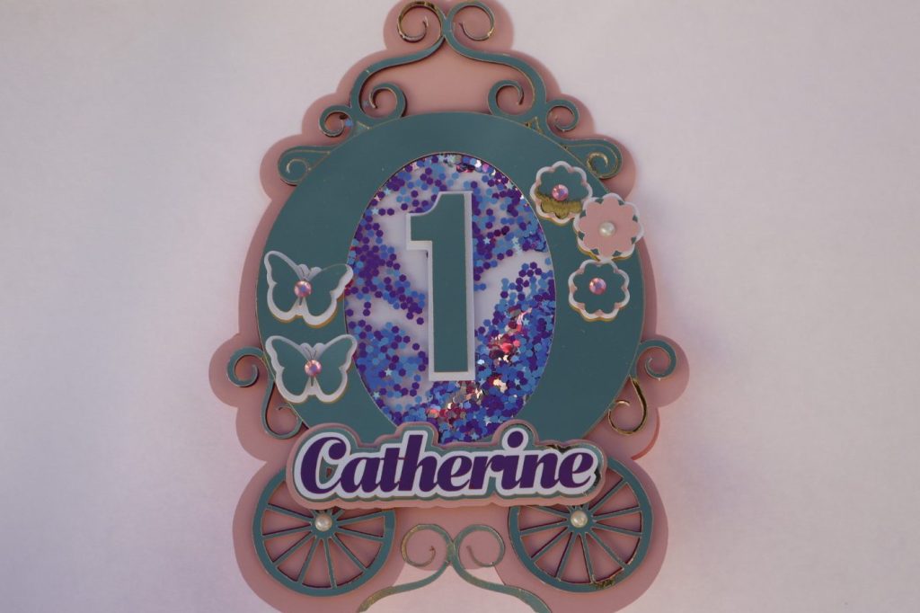 1 custom cake topper. Please provide the theme/colors and the name for the cake topper.