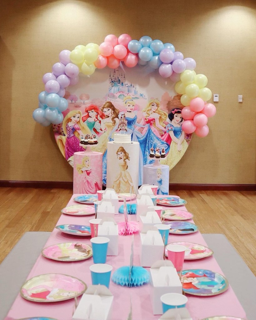 Package includes custom 1 round princess backdrop, 3 princess pedestals.*Add balloon garland for extra fee. Total cost with balloons like the picture is $600.