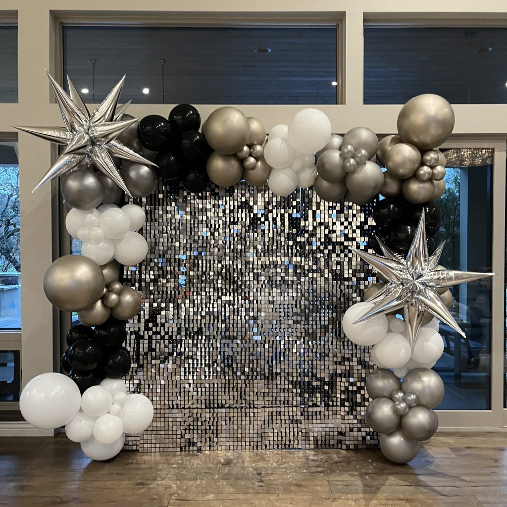 1 10×10 silver sequin backdrop. *Add balloon garland for extra fee.